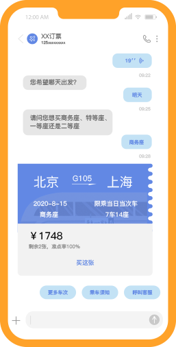 借助 Chatbot 聊天交互模式,可满足多元化的在线购票需求,包括航班信息查询与订购、高铁票购买、影院电影票预订等,并且能够在同一对话窗口内直接完成票务预订等交互操作,这种交互方式还适用于餐厅订位、景点门票购买等诸多场景。